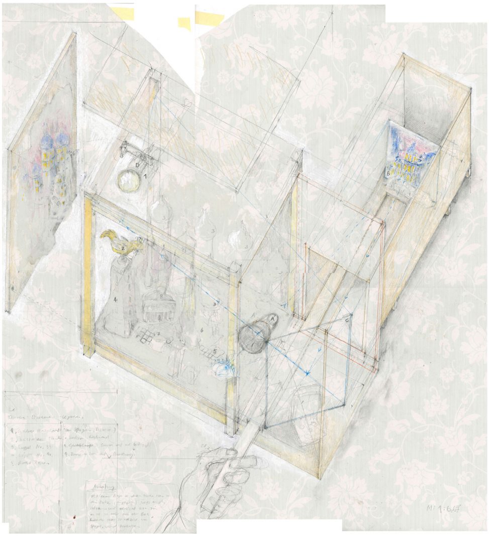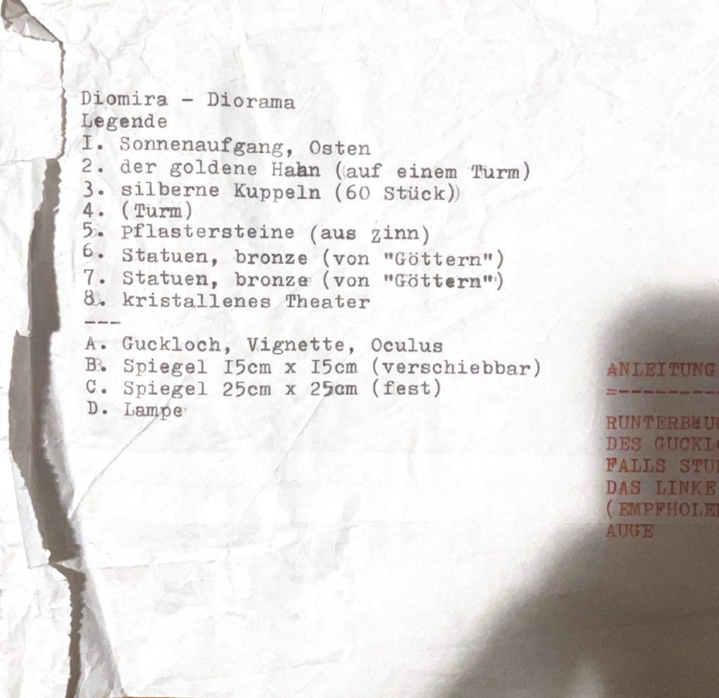Ähnlich wie bei einem Baufeld wurde die Umgebung sowie der Kontext der Wörter innerhalb dieser Erzählung analysiert, um einen Einstieg zu finden. Bereits im Stadtnamen lassen sich Absichten erkennen: Diomira ist – wie die anderen Städte im Werk – ein weiblicher italienischer Vorname, der aus den althochdeutschen Wörtern diot (= das Volk) und mari (= berühmt, bekannt) hervorgeht. Die architektonischen Elemente, die zunächst beschrieben werden, erscheinen besonders prunkvoll, beinahe absurd luxuriös – etwa in der Form eines „kristallenen Theaters“. Diese Architektur wird als eine Sammlung „schöner Dinge“ dargestellt, ohne dass weiter auf sie eingegangen wird. Sie dient vielmehr als Kulisse für die persönliche Erfahrung, die der Reisende macht. Christoph Schulten vertritt die Auffassung, dass Architektur vor allem aus dem Bauen vor Ort und ihrer Wirkung in der Umgebung entstehen sollte. Das Entwerfen auf dem Papier würde die Auseinandersetzung mit spezifischen örtlichen Gegebenheiten ignorieren und ihr im Weg stehen. In ähnlicher Weise wurde auch diese Aufgabe bearbeitet. Nachdem in der Gruppe Einigkeit über das Textverständnis und die Deutung herrschte, wurde versucht, sich durch das Bauen der Stadt Diomira anzunähern. Zunächst galt es, die Kulisse der Erzählung nachzubilden, um ein Gespür für die Atmosphäre zu entwickeln. Ohne konkrete Planungen begann man direkt mit dem Modellieren. Als Material wurde Ton gewählt, da er flexibel und jederzeit neu bearbeitbar ist. Basierend auf der Aufzählung der in der Stadt beschriebenen Objekte wurden diese nach und nach geformt, nachdem die Modellgröße festgelegt worden war. Im Fokus stand dabei die Trennung zwischen der oberflächlichen und der subjektiven Erscheinungsform der Stadt. Klar war, dass sich diese Deutungsformen auch in Sprache und Darstellung voneinander unterscheiden müssen, sodass sie – wie in der Erzählung – in Konflikt miteinander geraten. Das Werkzeug des Blicks spielt hier eine besondere Rolle, da es die beiden Ebenen – die der gebauten und die der erinnerten Stadt – miteinander verbindet. Nachdem sowohl die Kulisse der Stadt als auch die Position des Spiegels definiert waren, stellte sich die Frage nach einem Gehäuse. Aus Fundstücken bereits verwendeten Holzes wurde eine einfache Konstruktion gebaut, die es ermöglichte, das Geschehen nur aus einem bestimmten Blickwinkel zu betrachten. Um der Starrheit von Erinnerungen entgegenzuwirken, wurde ein beweglicher Spiegel eingebaut, der die sich wandelnden Gedanken versinnbildlichen soll. Die Erinnerung sollte zudem aus größerer Distanz erfasst werden. Dafür wurde das Gehäuse samt Inhalt zeichnerisch dokumentiert.