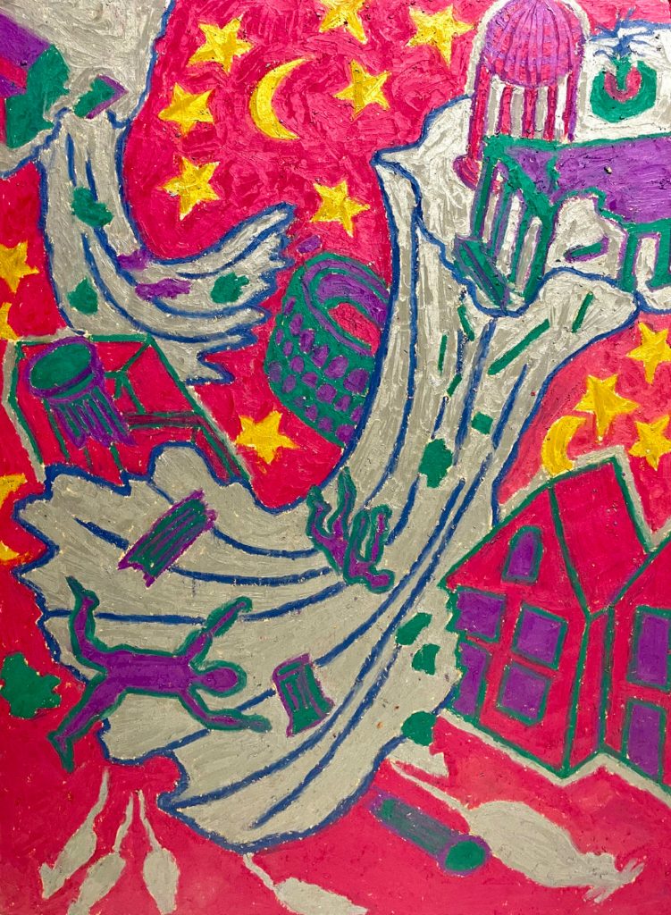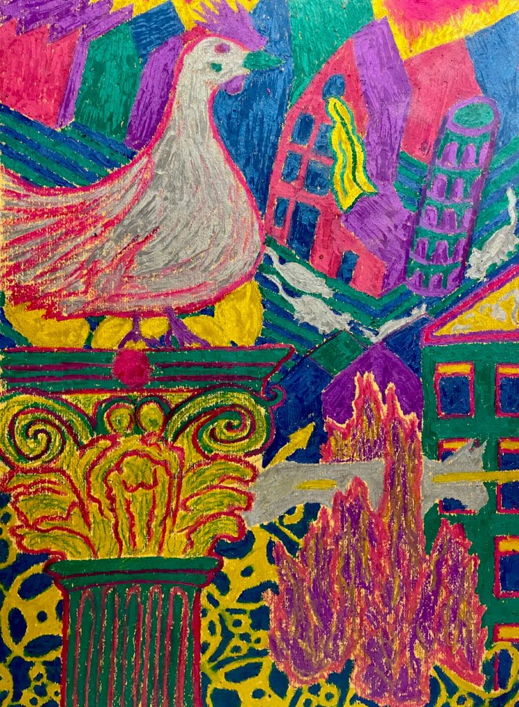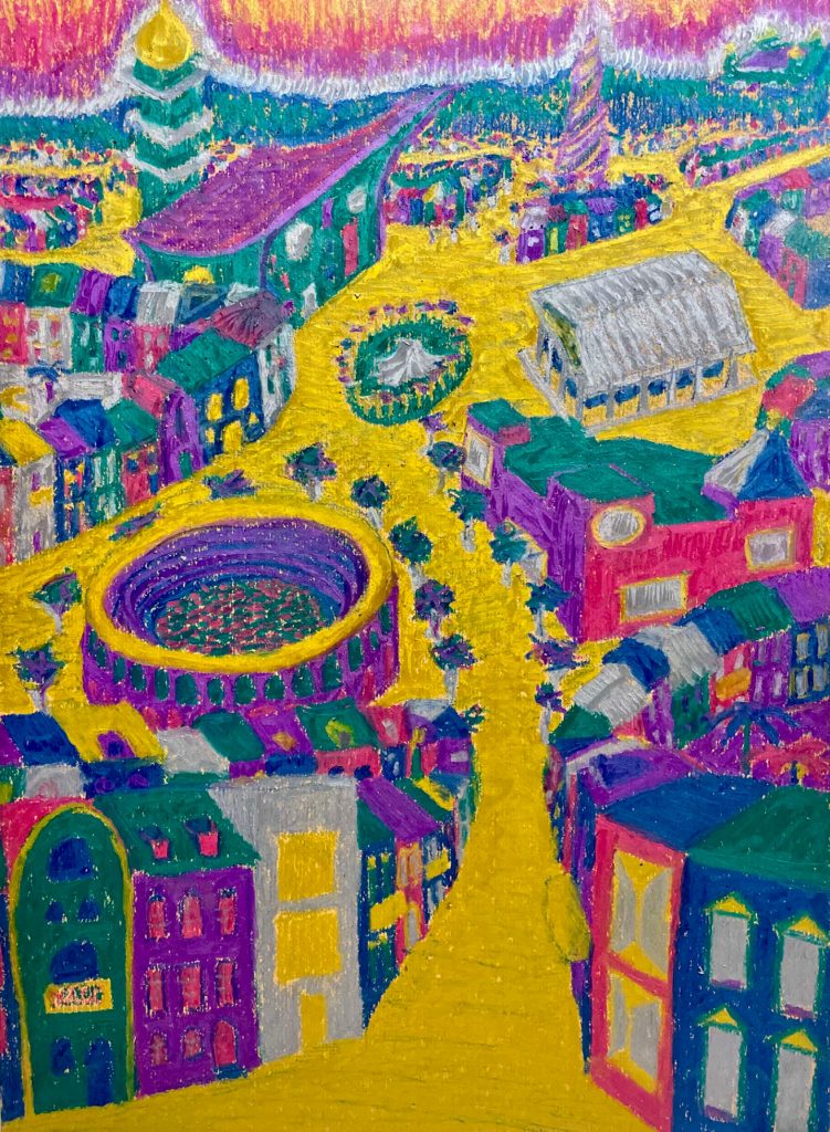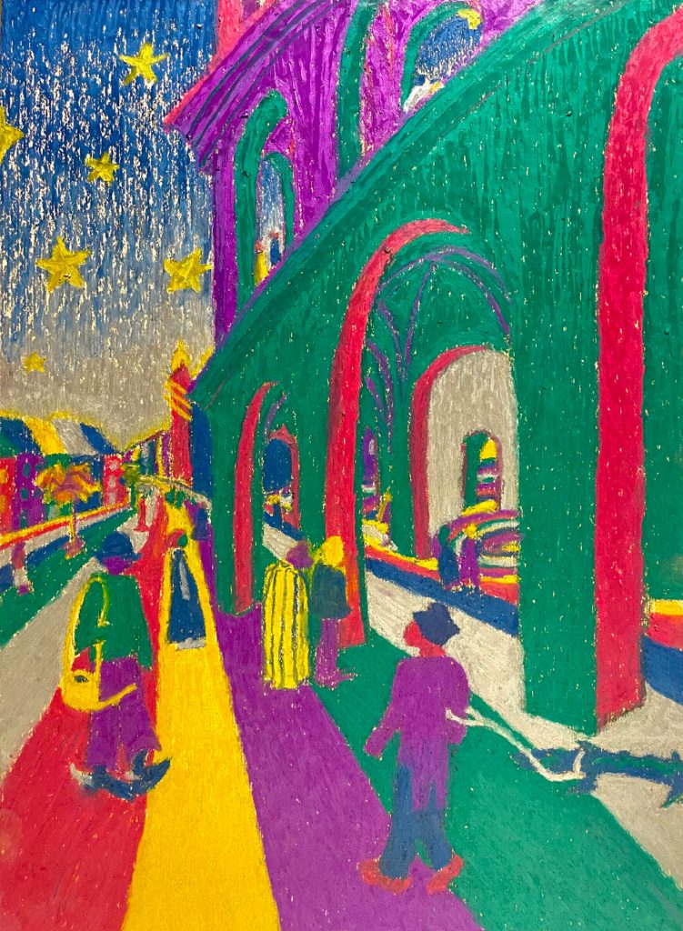 Clarice, eine der „unsichtbaren Städte“ in Italo Calvinos gleichnamigem Werk, verkörpert den Widerspruch zwischen Ideal und Realität, zwischen kollektivem Gedächtnis und ständiger Transformation. Calvino beschreibt Clarice als eine Stadt, die in drei Zyklen existiert: als glanzvolles, unerreichbares Ideal („Glanz“), als zerbrochene Fragmente vergangener Pracht („Zerbrochen“) und als Wiederaufbau aus wiederverwendeten, jedoch fremdgesteuert zusammengesetzten Teilen („Wiederaufbau“). Die Stadt ist ein „endloses Rätsel“, das sich durch Überlagerungen, Vergessen und Neudeutung stetig wandelt – ein kollektives Gedächtnis, das niemals zur Ruhe kommt. Christoph Schultens Entwurfsstrategie des „Nehmens, was da ist“ und des „Recyclings von Bestehendem“ lässt sich auf Clarice übertragen: Ihre fragmentierte Identität verlangt nach einer Sichtbarmachung durch intuitive, materialbezogene Interventionen. Ziel ist es, die Stadt nicht als statisches Gebilde, sondern als prozesshafte Collage aus Erinnerung und Neuerfindung zu begreifen. Analog zu Schultens Kontextanalyse liegt der Fokus auf dem Einfühlen in den Ort – nicht auf einer perfekten Rekonstruktion, sondern auf dem Erfassen von Stimmungen und Atmosphären. Die künstlerische Darstellung Clarices folgt der Leitidee, gebaute und offene Räume – Straßen, Plätze – als Stadtkörperzu inszenieren, der zwischen solitären und fließenden Strukturen oszilliert. Inspiriert von Umberto Boccionis dynamischer Malerei („Die Straße betritt das Haus“) entstehen flächige Pastellskizzen, die durch reduzierte Umrisse und harmonische Farbkombinationen eine atmosphärische Dichte vermitteln. Die Farbpalette spiegelt Clarices Zyklen wider: glänzende Goldtöne für den „Glanz“, bröckelnde Grau- und Ockertöne für das „Zerbrochene“ sowie kontrastierende Neonakzente für den fremdgesteuerten „Wiederaufbau“ und das Neue. Die Bilder fungieren als visuelle Dialoge, die Schultens Prinzip der Einfachheit durch Reduktion aufgreifen, um die komplexen Schichten urbaner Erfahrung sichtbar zu machen.